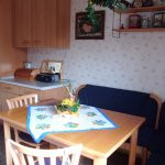 Im Haus ist unten die gemütliche Wohnküche mit Komfortausstattung wie Geschirrspüler, Herd, Backofen, Mikrowelle, Kaffeemaschine, Wasser- und Eierkocher, Toaster, Kühlschrank, Radio. Das Wohnzimmer hat eine große (ausziehbare) Sitzecke, Kaminofen, TV, DVD und Radio/CD. Im Keller gibt es die Möglichkeit eine Gefriertruhe, Waschmaschine und Trockner zur nutzen. Gäste-WC, Abstellraum.